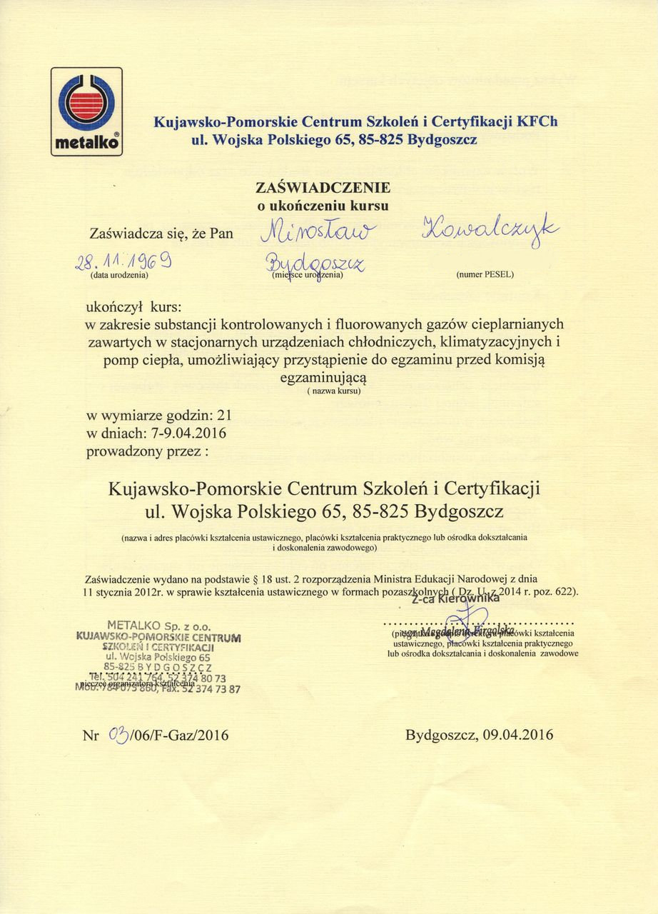 Certyfikaty Szukaj: SerwisujemyPompy ciepła Junkers Bosch Pompy ciepła Buderus Pompy ciepła Stiebel Eltron Aktualności Bosch Compress 4000 DW i 5000 DW Oszczędzaj do 70% energii! 26.08.2017 Nowe urządzenia Buderus Logatherm WPT 10.04.2017 Nowa pompa ciepła Stiebel-Eltron WPL 07-17 ACS classic 26.03.2017 Odwiedziło nas12 173 osób Posiadamy wszystkie niezbędne certyfikaty i uprawnienia. Potwierdzają to skany dokumentów zamieszczone poniżej. Czy wiesz jakie obowiązki nakłada na Ciebie ustawa F-gazowa? Możesz zlecić nam wszystkie formalności: rejestracje w CRO oraz pamiętanie o wszystkich przyszłych zobowiązaniach. Skontaktuj się z nami! Serwisujemy urządzenia takich marek jak